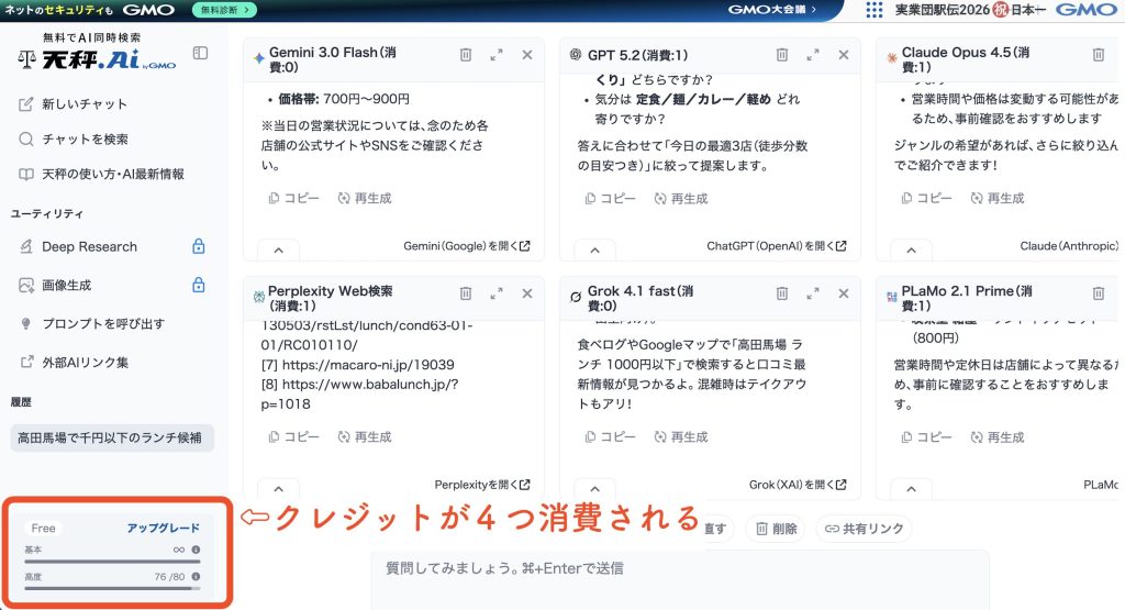 消費クレジット0の標準AIとクレジット消費1の高度AIを組み合わせて使えば、合計80回無料で同時検索できるため、組み合わせ次第で普通に使い続けることできますよ。