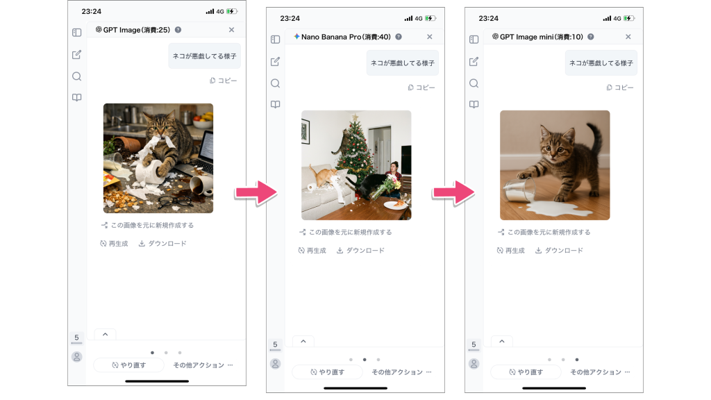 画像生成も複数AIで同時に生成でき、4G回線でもスムーズに生成できました。